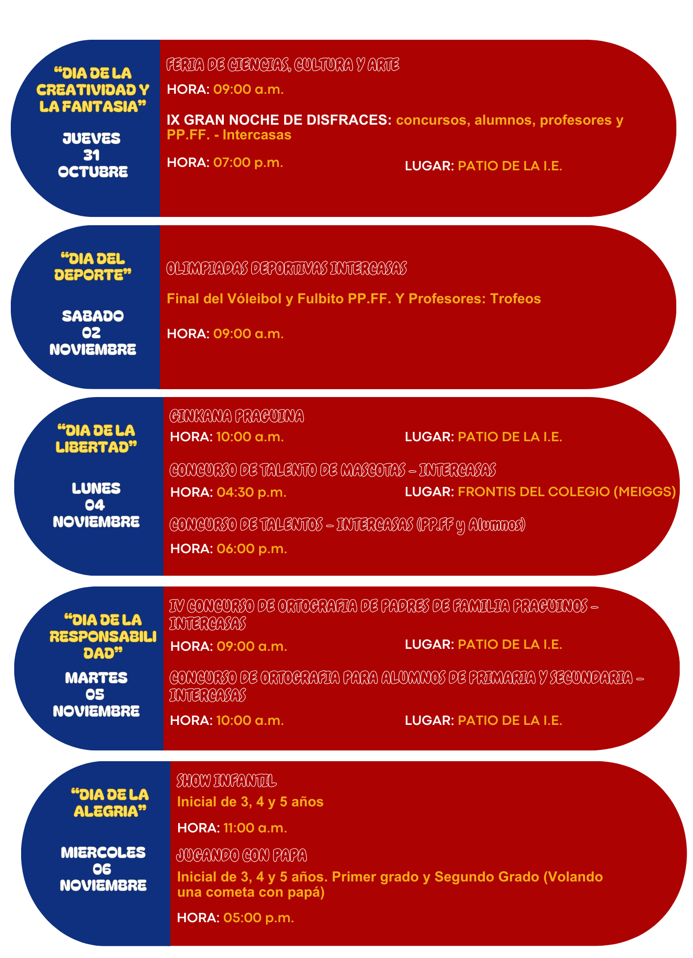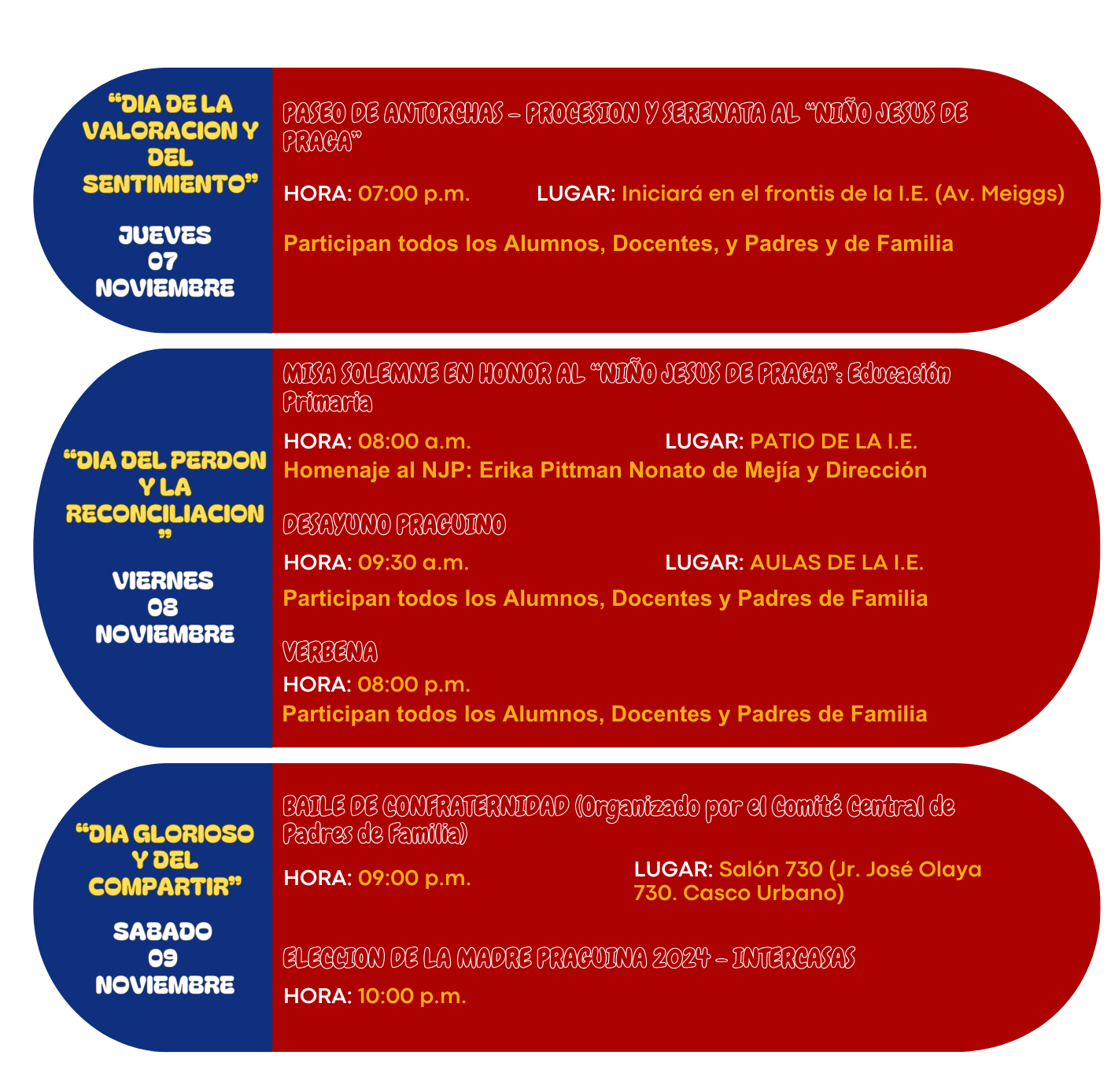 A pesar de los momentos tan difíciles que estamos pasando estamos celebrando nuestro Aniversario con mucho optimismo y entusiasmo porque la familia Praguina somos líderes de la alegría, de los retos y las emociones fuertes, nos gusta competir, por eso tenemos dos casas: Rojo y Azul; el 50% de nuestros alumnos integran cada casa tanto inicial como primaria y secundaria, profesores y padres de familia participando en todas las actividades recreativas culturales donde aportan puntos a sus colores, con el fin de obtener la mayor cantidad de puntaje.