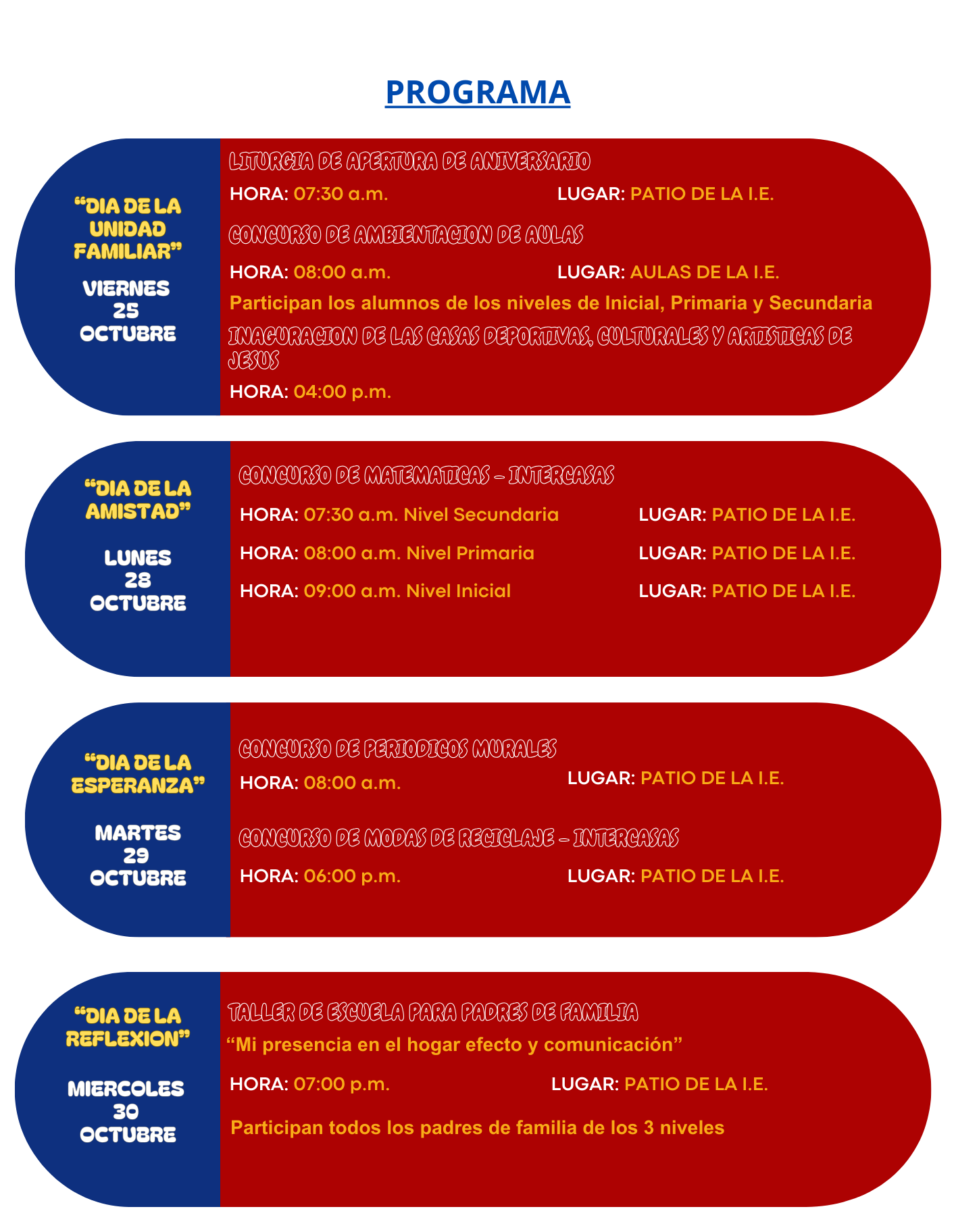 A pesar de los momentos tan difíciles que estamos pasando estamos celebrando nuestro Aniversario con mucho optimismo y entusiasmo porque la familia Praguina somos líderes de la alegría, de los retos y las emociones fuertes, nos gusta competir, por eso tenemos dos casas: Rojo y Azul; el 50% de nuestros alumnos integran cada casa tanto inicial como primaria y secundaria, profesores y padres de familia participando en todas las actividades recreativas culturales donde aportan puntos a sus colores, con el fin de obtener la mayor cantidad de puntaje.